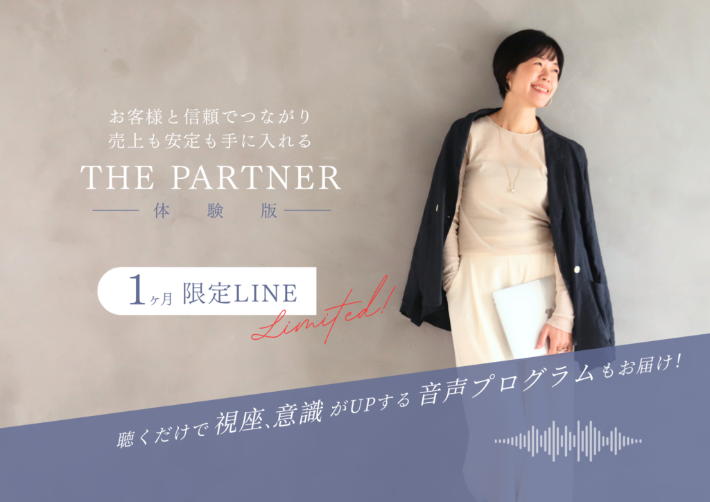 「いつか受けたいです」とよく言っていただく講座ですが、気軽にTHE PARTNERの雰囲気を体験できる場をご案内したいと思い、期間限定LINEを開設しました。聴くだけで視座と意識が高まる音声で学ぶプログラムもご用意します。