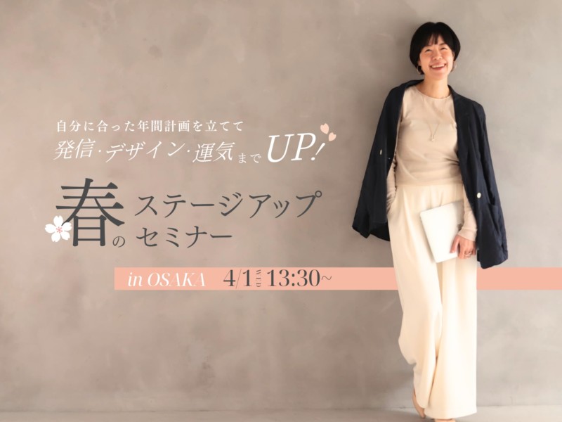 去年に続き今年も4月1日に「春のステージアップセミナーin Osaka」を開催します。自分にあった年間計画の立て方を学び、発信やデザインも格上げし、運気もアップさせる(皆でお参りします)企画になっています。ピンと来た方はぜひご一緒しましょう。